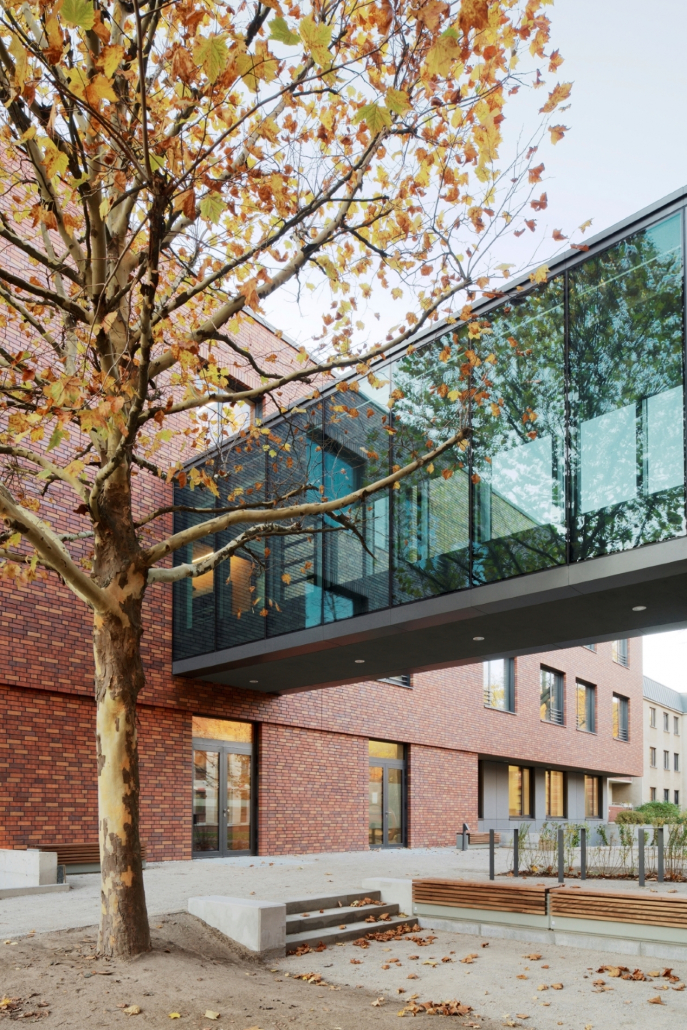 Eine Zäsur des Baukörpers wird durch Auskragen der Pflegegeschosse des 1. und 2. OGs und einen Wechsel der Materialität der Fassade von Ziegel zu Glas erreicht. Dies unterstreicht zudem die unterschiedlichen Funktionen und macht diese von außen ablesbar.